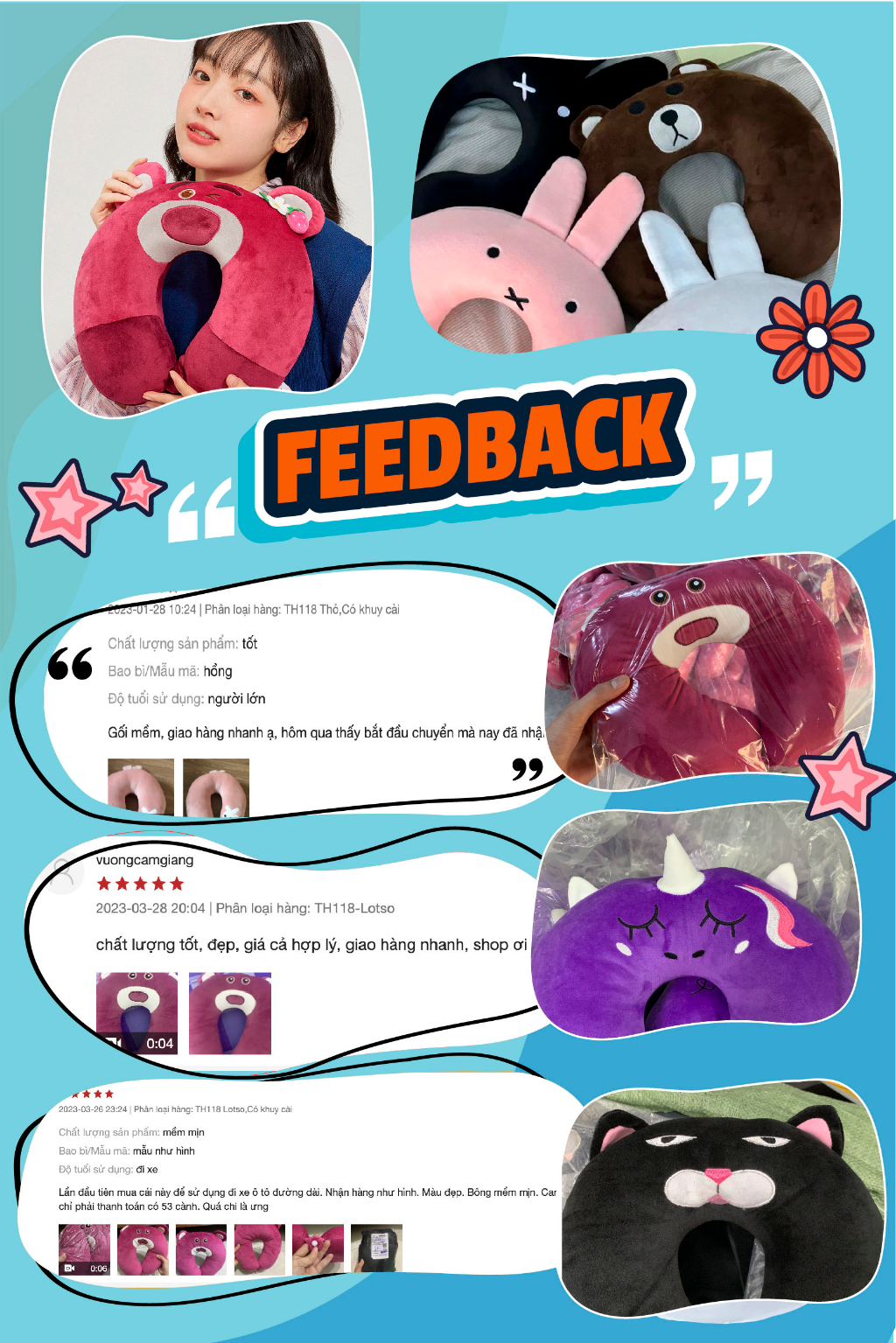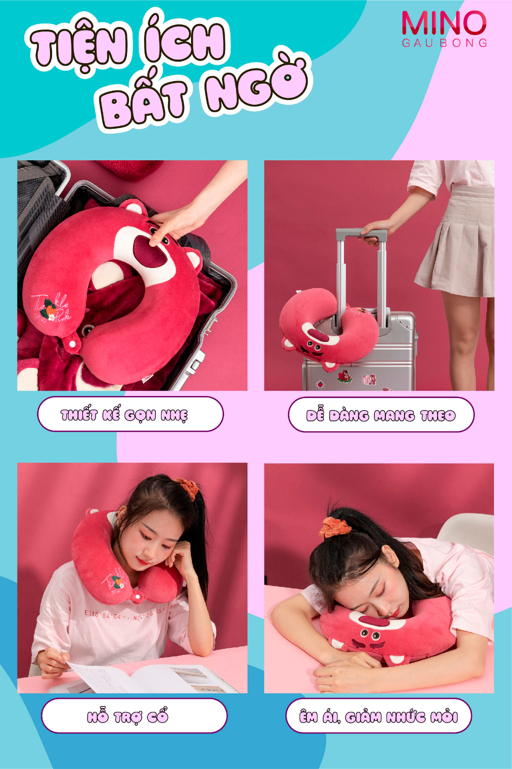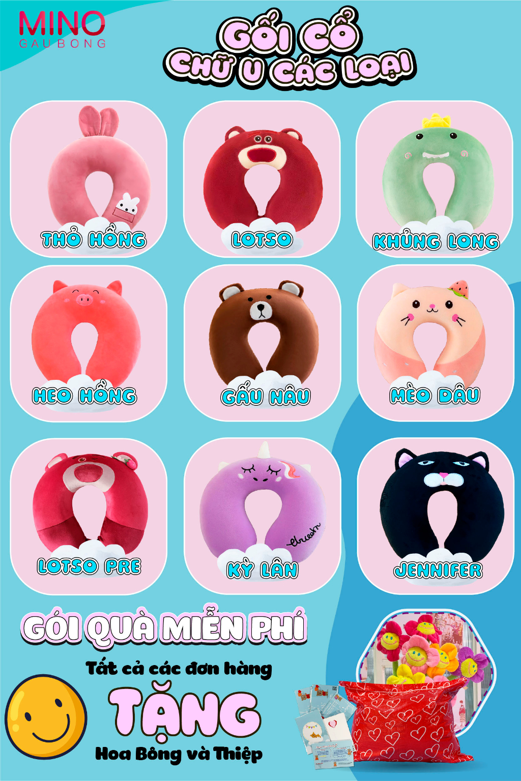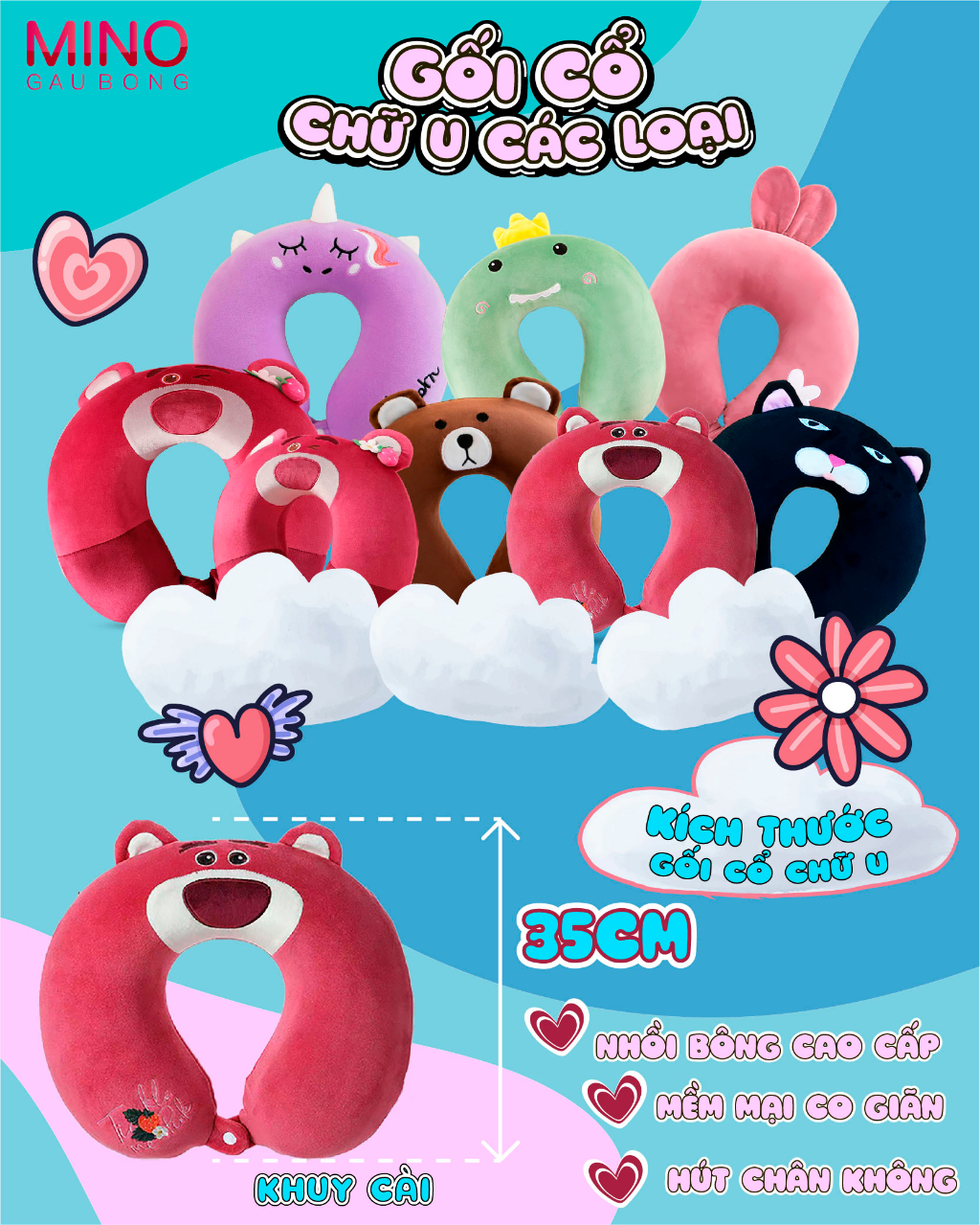 TÊN SẢN PHẨM: Gối Cổ Chữ U Các Loại MINO STORE, Gối Chữ U Kê Cổ Có Khuy TH118? THÔNG TIN SẢN PHẨM :- Kích thước: 35cm- Thương hiệu: Mino Store- Chất liệu: Bông Silic Cao Cấp- Xuất sứ: Made in Việt Nam- Sản phẩm được đóng gói 2 lớp cẩn thận- Nếu sản phẩm cỡ to, sẽ được hút chân không nhỏ gọn để đảm bảo vận chuyển dễ dàng- Sau khi nhận hàng bạn vỗ đều sản phẩm để bông được căng đều như ban đầu- Sản phẩm có thể chênh lệch về màu sắc và size do các phương pháp đo khác nhau------------------------------------? CÁCH BẢO QUẢN - VỆ SINH- Đặt thú bông ở nơi thoáng mát, tránh ẩm ướt vì sản phẩm có độ hút ẩm rất cao- Giặt thú bông thường xuyên, tránh để quá lâu (2-3 tháng giặt 1 lần). Nên giặt bằng các loại xà phòng chuyên dùng giặt quần áo trẻ em để có thể bảo quản độ mịn của gối mền- Không nên giặt bằng máy với các loại thú bông. Đối với loại thú bông chất liệu lông nhung có thể giặt bằng máy nhưng nên hạn chế- Phơi thú bông dưới nắng to và đợi sản phẩm khô hẳn mới mang vào nhà----------------------------------------? CAM KẾT VỚI KHÁCH HÀNG- Không Đúng Mô Tả Khách Hàng Hoàn Toàn có thể hoàn trả hàng- Miễn phí vận chuyển theo chính sách của Shopee- Miễn phí trả hàng trong 7 ngày theo chính sách của Shopee- Sản phẩm 100% giống mô tả - có video quay sản phẩm- Đảm bảo chất lượng, dịch vụ tốt nhất, hàng được giao từ 1-5 ngày kể từ ngày đặt hàng- Giao hàng trên toàn quốc theo hình thức COD/ ví AIRPAY hoặc nhân hàng thanh toán.MINO STORE chúc quý khách mua sắm vui vẻ ! #gaubong #goicochuu #goico #goichuu #mino #gaubongmino #keco #gaubongcute #daubongdethuong #goilotso #goidau #goitulung